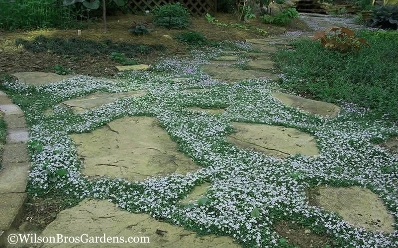 A very cute little creeping evergreen plant smothered with baby-blue star-shaped flowers in spring and then off and on throughout the season, Blue Star Creeper is one you’ll find growing in many sites throughout our gardens. Because it handles moderate foot traffic and consistently moist soil, we have it growing between stepping stones and pavers and as a lawn substitute. The 1-inch high plants with small, round, blue-green leaves spread by underground rhizomes so there’s no worry about the foliage covering stepping stones or pavers – no need for edging. We also use it as an underplanting for roses, shrubs, small trees such as Japanese maples, and as a soil cover in container gardens-even in pots situated in the garden pond! Just be sure to keep the tops of plants above the water surface. Needless to say, Blue Star Creeper is an indispensable plant in the Wilson Bros Gardens!
